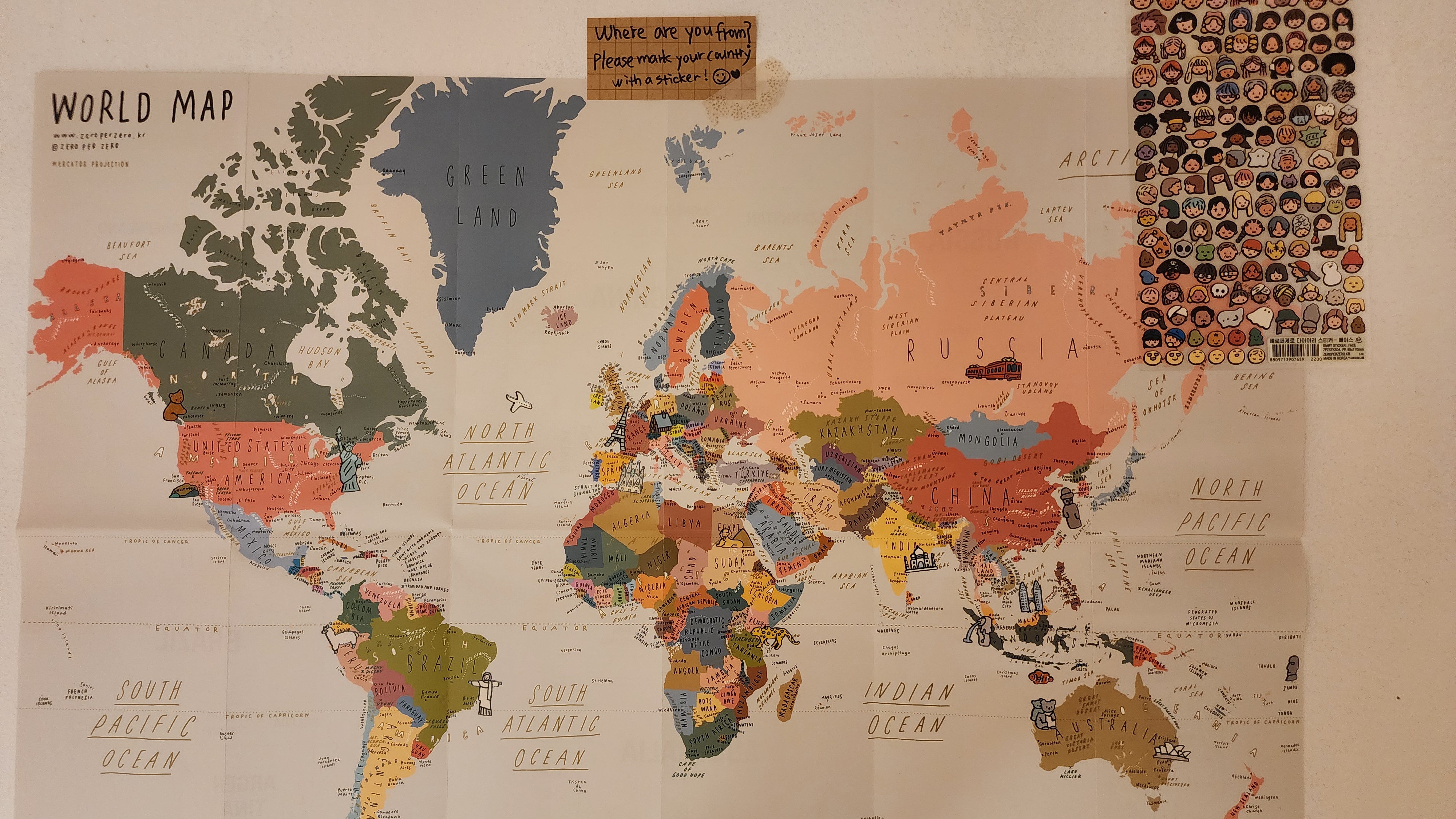 빈 벽을 활용해 세계지도에 귀여운 스티커를 붙여 어느 나라의 손님들이 다녀갔는지 볼 수 있게 하고,