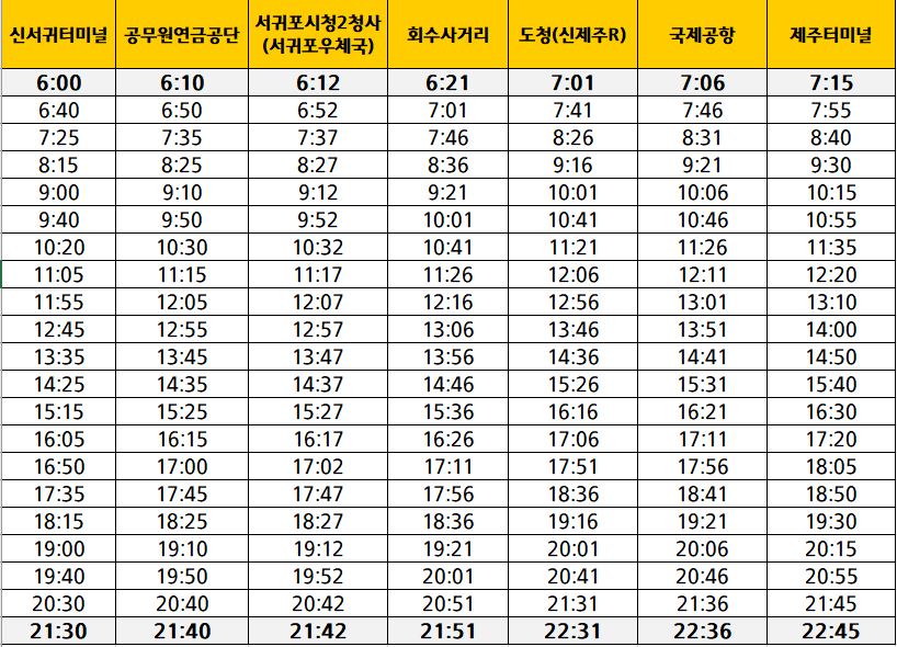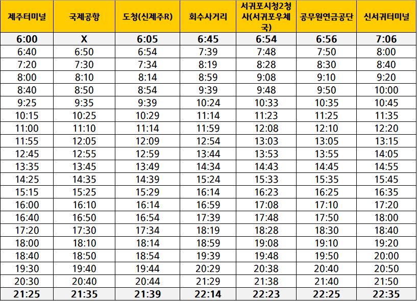 | 서귀포버스터미널➡유승한내들아파트➡서귀포해양경찰서➡삼다체육공원입구➡국세공무원교육원➡서귀포시청 2청사(서귀포우체국)➡강창학종합경기장➡농업기술원➡법화사사거리➡회수마을입구➡상창교차로➡정존마을➡롯데마트➡신제주로터리➡제주국제공항➡제주버스터미널 |