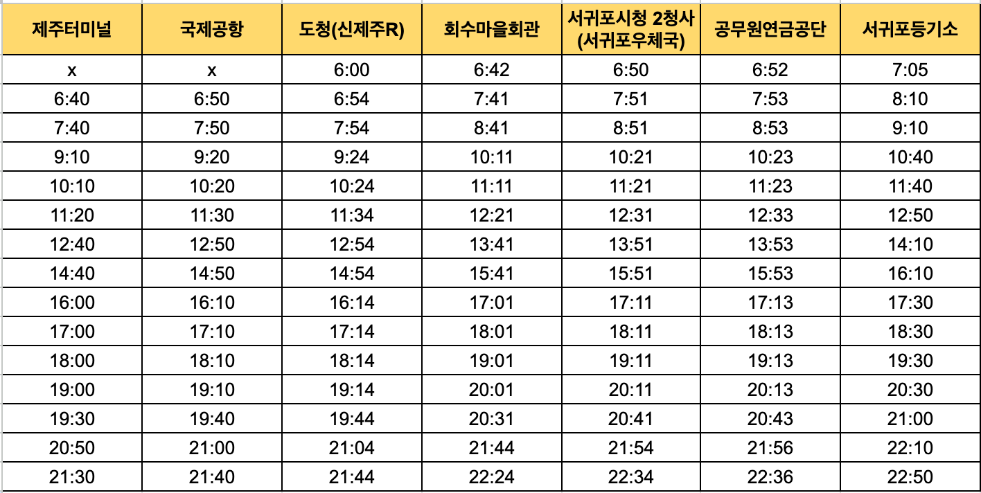 | 제주버스터미널➡제주국제공항➡신제주로터리➡연동365의원➡롯데마트➡정존마을➡상창교차로➡회수마을회관➡법화사사거리➡농업기술원➡강창학종합경기장➡서귀포시청 2청사(서귀포우체국)➡국세공무원교육원➡삼다체육공원입구➡ LH 1, 2단지 ➡ 서귀포환승정류장(서귀포등기소) |